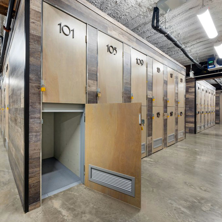 Welcome to your luxurious wine cellar away from home. Our subterranean wine vault spans 5,000 square feet with more than 100 individually alarmed units of twelve different sizes to accomodate both personal collections and business inventory needs. Our unit capacities range approximately from 190 to over 9,900 bottles. Each unit protects bottles from UV light and vibration, and is monitored for temperature and humidity to prevent harmful environmental fluctuations.